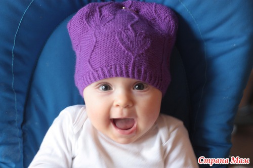 Вот что вышло со второй попытки. Пряжа элитная, в две нити, размер младенец. Скажу что на младенца все равно большая, думаю от полутора лет нормально будет. Пока заколола золотой булавкой,как мне когда-то бабушка закалывала))