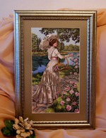 У меня новая картинка, вышивала чуть больше месяца. Размер картины в рамочке 44 х 65 см. Вышивала по оригинальному (китайскому) набору. Канва Aida 18, использовано 62 цветов, из них 16 блендов, в основном вышивается крестиком и полукрестиком, конечно много используется бэкстич, из сложнейших - кординг и фрузелки.