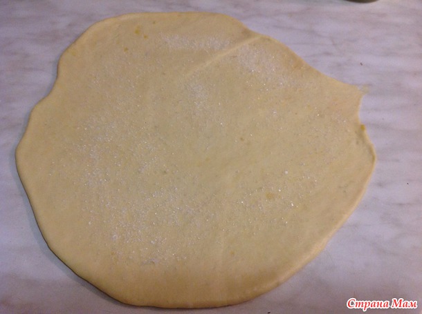 достаем тесто, раскатываем корж толщиной не более0,7 см и посыпаем сахаром