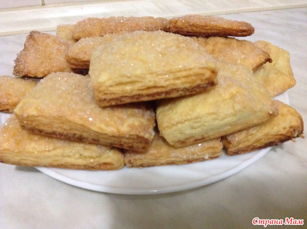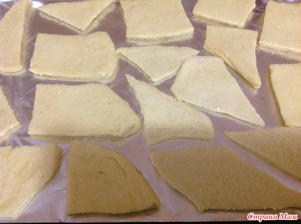 Складываем корж пополам и опять раскатываем. Дальше посыпаем сахаром и складываем пополам, в общем проделать это нужно 5 раз. Таким образом появляются слой посыпанные сахаром. Дальше разрезаем кусочками, как кому удобно и нравится. Обмакиваем в сахар и выкладываем на противень сахарный стороной вверх.