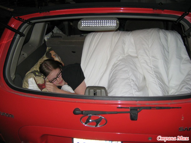 одеяло большое, нам хватит на 2-х, Лида решила спать в багажнике, а я на заднем сиденье.