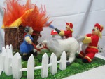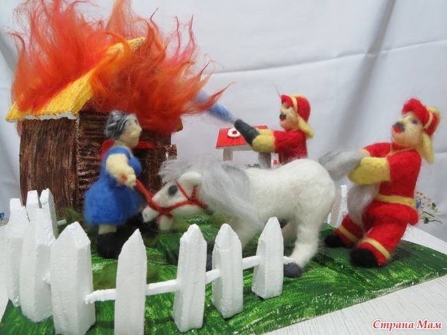 Здравствуйте, мамочки - рукодельницы! Задали нам в школе непростую задачку: сделать поделку на конкурс ко дню пожарника что то необычное, с юмором и из нестандартных материалов. Прошерстив интернет, наткнулась на коллаж, из серии про женщин в русских селениях, которые коня на скаку остановят и в горящую избу войдут. Не долго думая, помчалась в магазин и накупила нехватающих оттенков шерсти, затем принялась воплощать картинку в жизнь. Когда все элементы и герои были сваляны, я решила, что не хватает колодца, и тут пришел мне на помощь муж, который помог его воплотить в жизнь, на ходу мы стали додумывать, что колодец должен быть пожарным да и еще на колесах, типа пожарные с собой его привезли! Посмеялись с ним, потом собрали всю композицию в единое целое и вот... получилось то, что получилось! все фото можно посмотреть в альбоме у меня. Спасибо что заглянули.