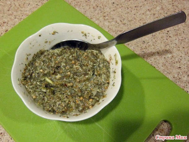 Смешиваю в пиалке то что я люблю по запаху и вкусу: (на глаз) соль, перец черный молотый, белый перец горошком, сухой укроп, смесь итальянских трав, горчицу в семенах, натертую на мелкой терке гиганскую луковицу репчатую, и 3 больших головки чеснока (не зубчика, а головки) тоже натертые на малкой терке, сок 1 свежего лимона, хорошо перемешать это зелье.