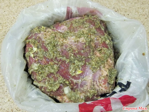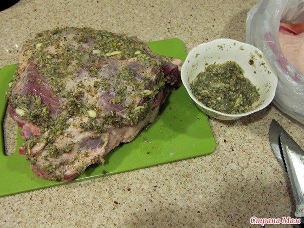 Прокалываю толстые места длинным ножом и запихиваю туда маринад и вдоль костей тоже и потом уже хорошо обмазываю со всех сторон, не жалея