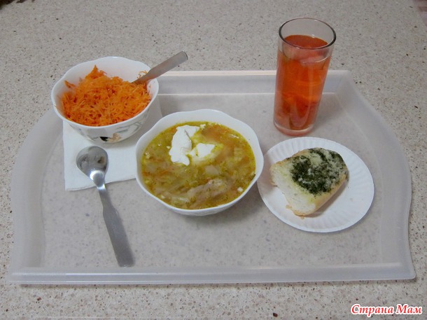 На обед муж попросил щи. Только ему сделала с помидорным салатом, а нам с Лидой с натертой на терке морковкой. Ну и всем с хлебом с сыром, чесноком и укропом, и всем компотик.
