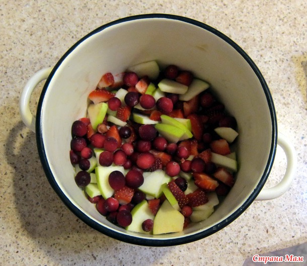 Еще пока пироги пекла, решила и компотик сварить (яблоки, клубника и еще мороженная клюква)