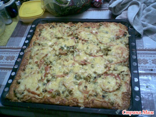 Потом чистила креветки, потом мидии и кальмары, терла сыр и давила оливки, без косточек у нас в деревне не было! Поставила походить тесто и в 15.30 пиццу поставили в печь. Как раз детишки подъехали. И вот что получилось.