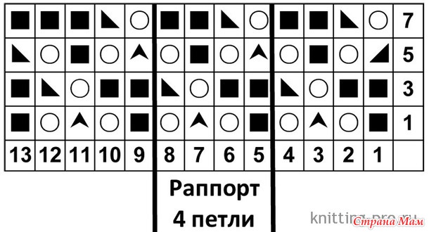 1-й ряд: * 1 лиц. п., накид, 3 вместелиц. перекидом, накид. *, повт. до конца ряда, в конце 1 лиц. п.;