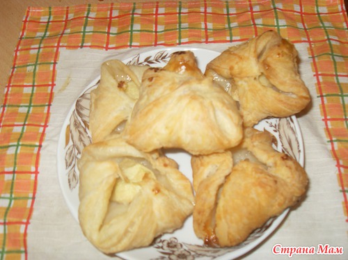 В каждый квадратик добавила кусочек чищенного яблока и посыпала сверху сахаром, защипнула тесто в узелок и выпекала в духовке 15-20 мин при температуре 180-200 гр.