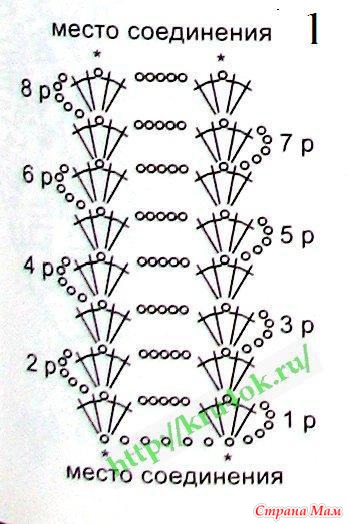 Данная модель состоит из трех частей. Начните работу по рисунку 1. Провяжите 32 ряда и замкните полученную деталь в кольцо соединительными столбиками в местах, обозначенными на рисунке 1 звездочками ( *).
