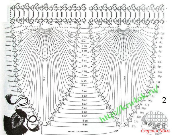 Далее выполняйте вторую часть по рисунку 2, которая вяжется на боковых фестонах первой чаш по кругу. На рис. 2 сумочка дана в разложенном виде. Провязав 21 ряд по рис., в 22 ряду выполните соединение в местах, отмеченных звездочками и стрелками. Третья часть вяжется по рис.3, также по кругу на боковых фестонах первой части. Из оставшейся пряжи сделайте витой шнур и протяните его сквозь арочки ВП первой части. Украсьте сумочку кистями длиной 10 см в готовом виде, как показано на снимке. Кисти прикрепляются на боковые цепочки из 5 ВП.