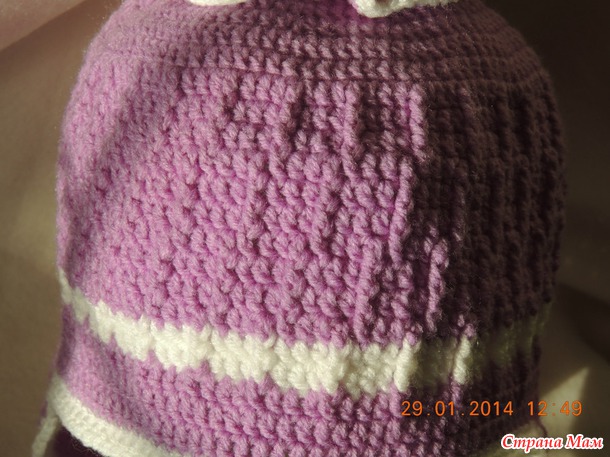 На улице наконец-то зима наступила, морозец - 20, а у меня связалась шапочка на весну для дочки как раз под новый костюмчик.