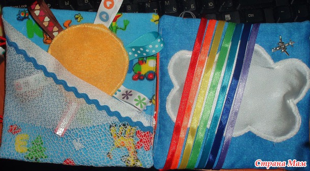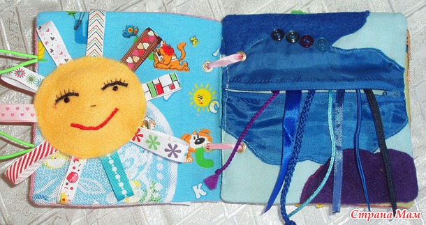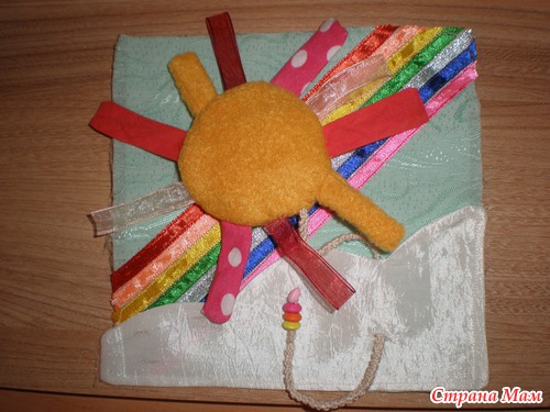 Солнышко застёгивается лентами по цветам радуги. Думаю, подойдёт детям 3-5 лет.