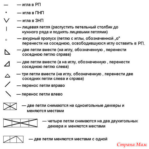 На ручных вязальных машинах кроме кулирной глади (чулочной), с помощью дополнительных ручных операций можно получить множество производных переплетений: ажурных, прессовых, мережковых, многоцветных и т. д. Схемы узоров записаны с помощью условных обозначений: