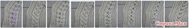 7-ой р.: 4 п. перекрещенные направо (= снять 2 п. на доп. спицу, за работой, вязать след. 2 п. лиц., затем 2 п. с доп. спицы лиц.).