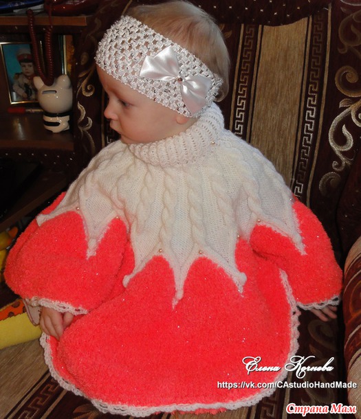 Описание здесь: Http://grukhina.ru/iblock/schema/poncho/poncho_dlja_devochki/. Правда "мех" у меня из пряжи yarnart happy (кстати он блестит если этого не видно на фото), пряжа толстая, поэтому если вязать по описанию, то получается ОООООчень широко, волнисто внизу и изделие тяжелое. Пришлось убавлять количество петель как мех пошел. Ну и ворот я набирала меньше конечно, а потом сразу после ворота прибавила сколько не хватало.
