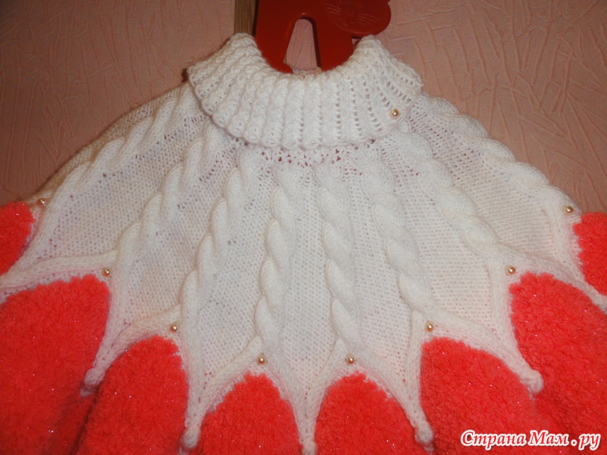 Описание здесь: Http://grukhina.ru/iblock/schema/poncho/poncho_dlja_devochki/. Правда "мех" у меня из пряжи yarnart happy (кстати он блестит если этого не видно на фото), пряжа толстая, поэтому если вязать по описанию, то получается ОООООчень широко, волнисто внизу и изделие тяжелое. Пришлось убавлять количество петель как мех пошел. Ну и ворот я набирала меньше конечно, а потом сразу после ворота прибавила сколько не хватало.