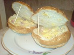 Из нижней половинки булки вынимаем мякиш, режем его небольшими кусочками, кладем в мисочку, туда же добавляем натёртый сыр, грудинку, сырое яйцо, немного майонеза. Можно добавить грибы, оливки, соленые огурцы, это уже на ваш вкус! Все перемешиваем и начиняем наши булочки.