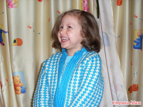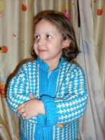 Нашла очень интересный, легкий в исполнении, рельефный узор двухцветной вязки и сразу воплотила его в кофточке дочке, рисунок здорово смотрится на детских вещах!