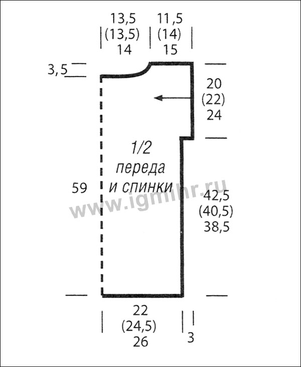 Внимание! Спинка и перед вяжутся поперек. Стрелка на выкройке - направление вязания.