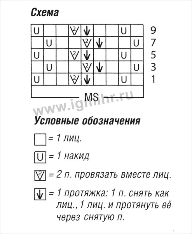 Ажурный узор: число петель кратно 9 + 2 кром. Вязать по схеме, в изн. рядах петли и накиды вязать изн. Повторять петли раппорта.