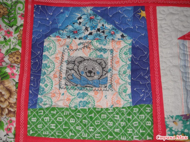 Изначально шилось как детское одеяло. Но после машинной стёжки стало, мягко говоря, жестковатое. Поэтому кайму я простегала только двумя пересекающимися линиями, чтобы хоть немного было помягче. «Жильцов» в домики собирала с миру по нитке. Хорошо в городе, если что нужно – пошла в магазин, точнее в магазины и выбрала. У нас такого, конечно, никогда не будет, (живу в небольшом лесном посёлке) вот и получается – я его слепила из того, что было.
