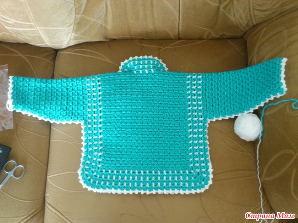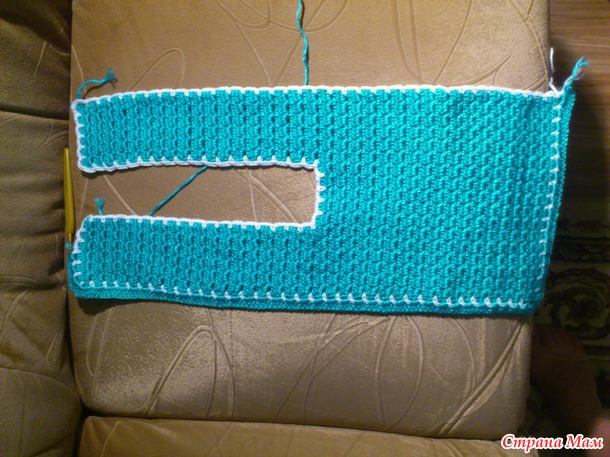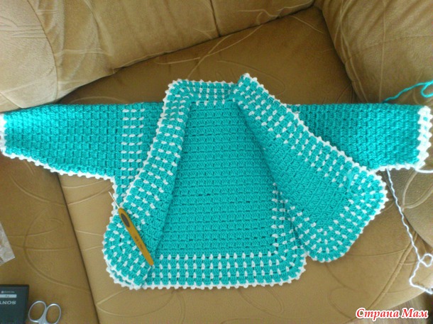 Когда полочки и спинка были связаны, присоединила белую нить и стала обвязывать все по периметру - ст. бн, 3вп, ст. бн,3вп...