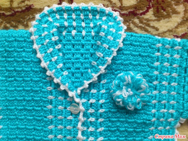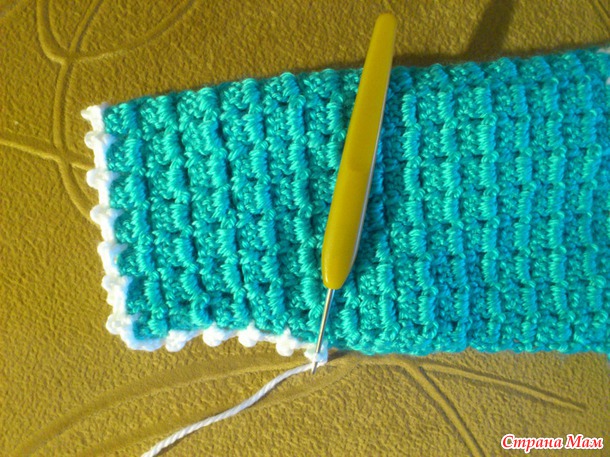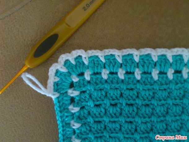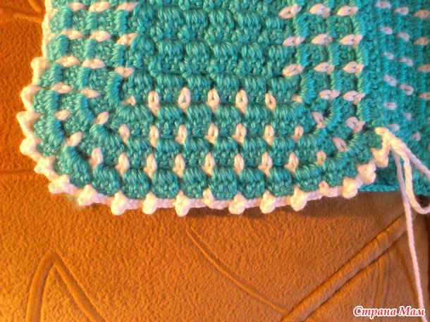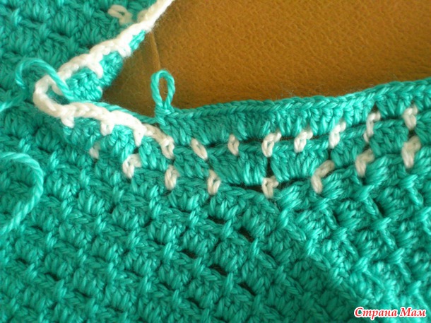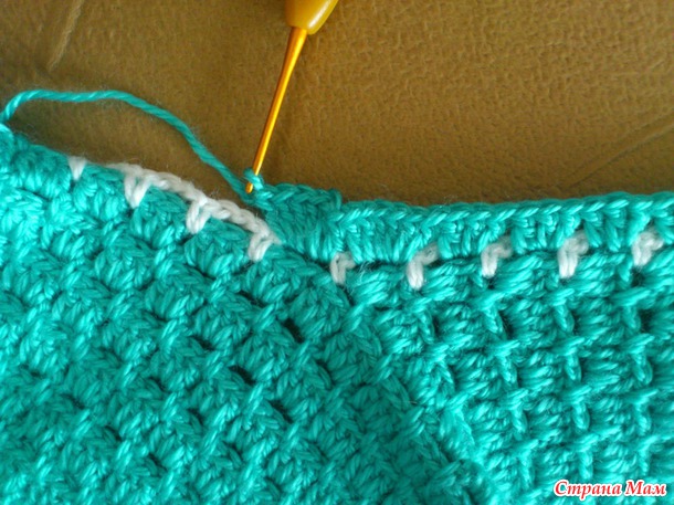 Ну вот, обвязала бирюзовой ниточкой по периметру, и опять белой ряд из арочек через каждые 3ст. сн