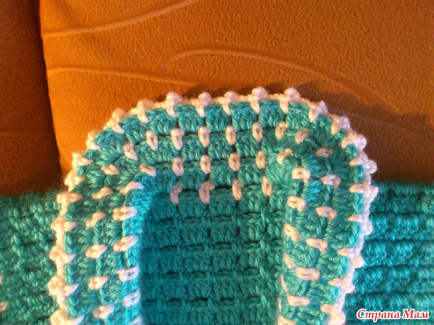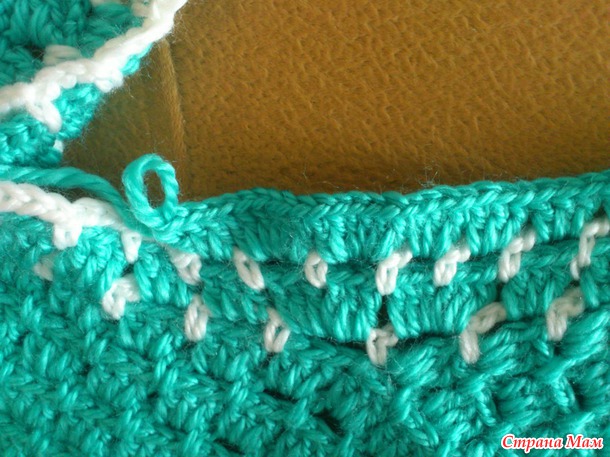 Ряд белой ниточкой закончила, опять вяжу бирюзовой - в каждую белую арочку 3ст. сн. А вот на закруглениях в уголках вязала 5ст. сн+5ст. сн