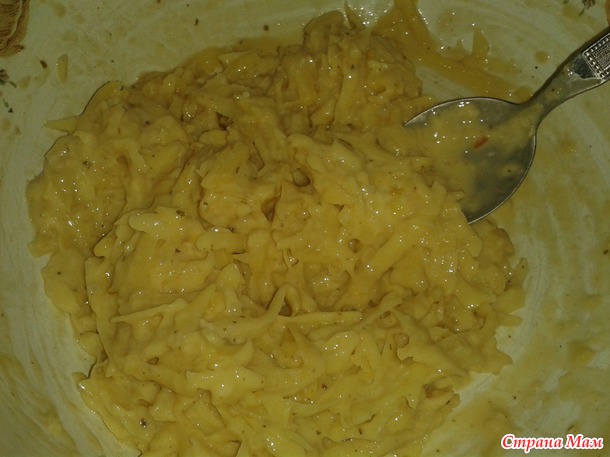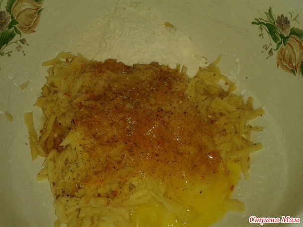Трём сырой картофель на крупной тёрке, добавляем яйцо, соду, соль, приправки, муку. Если картофель не сочный, можно добавить кефира