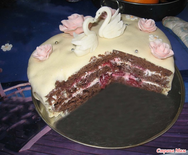 Крем: сметана + сахар + ваниль. Между слоями выложила клубнику и вишни.