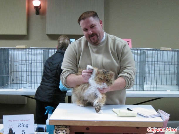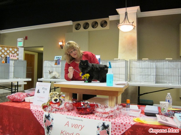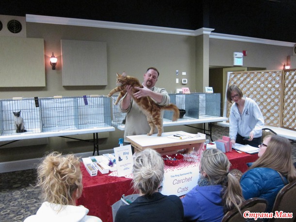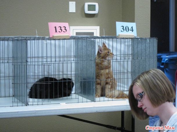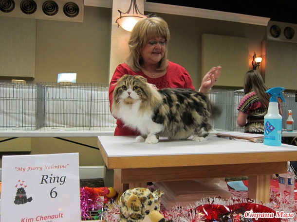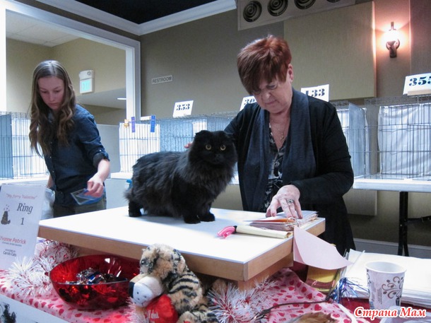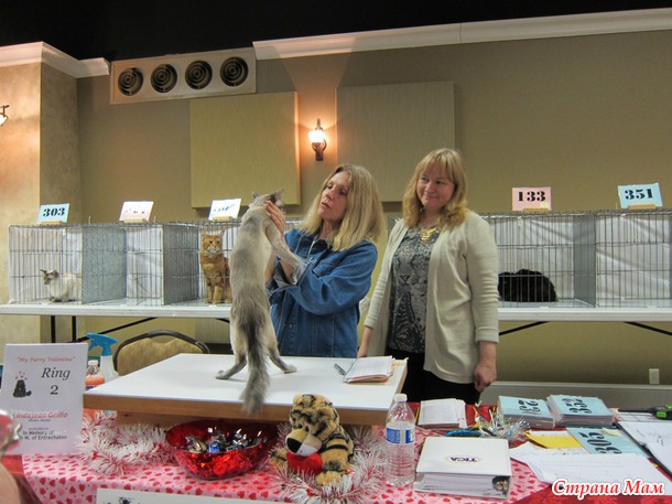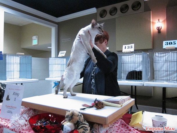 В 9 утра приехали на выставку, всё внесли, расставили. Судьи начали судейство только в 10 утра. Было 6 судей, так что 6 рингов надо было пройти, наш номер 133. Случайно нас сначала внесли в группу чемпионов породистых, но я сходила и исправила, что мы стерилизованные и нас перенесли в группу стерилизованных породистых