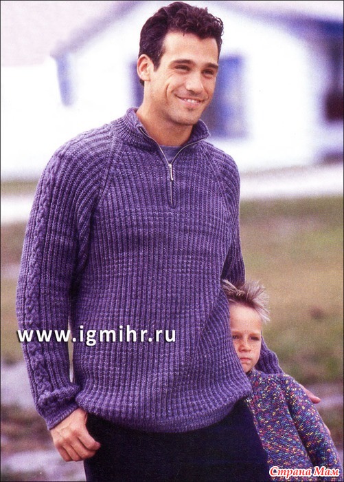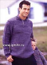 Сборка. Выполнить швы реглана. На круговые спицы по вырезу горловины набрать 121 п. и связать резинкой 14 см, петли закрыть. Обвязать крючком 1 р. «рачьего шага» (ст. б/н слева направо) края разреза и половину воротника по высоте. Вшить молнию по краям разреза и половине воротника. Отвернуть воротник наполовину внутрь и пришить. Выполнить боковые швы и швы рукавов.