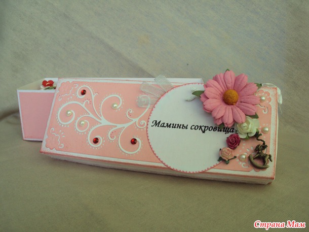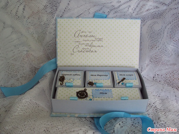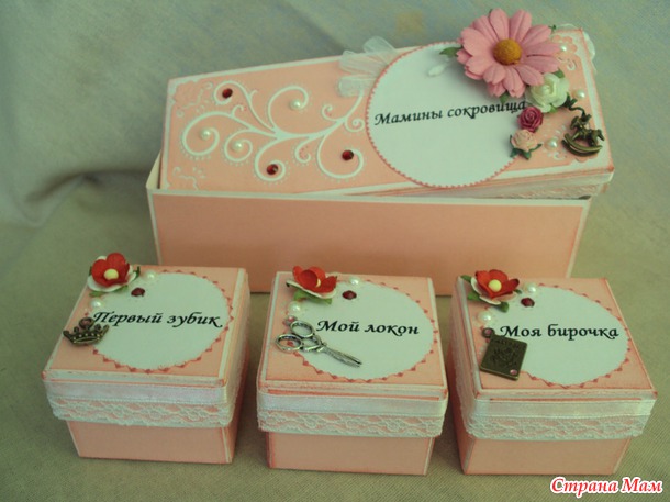 Ну и моя первая работа - Мамины сокровища. Попросили сделать на заказ. Попробовала с простой коробочки, бумажной, с тремя маленькими.