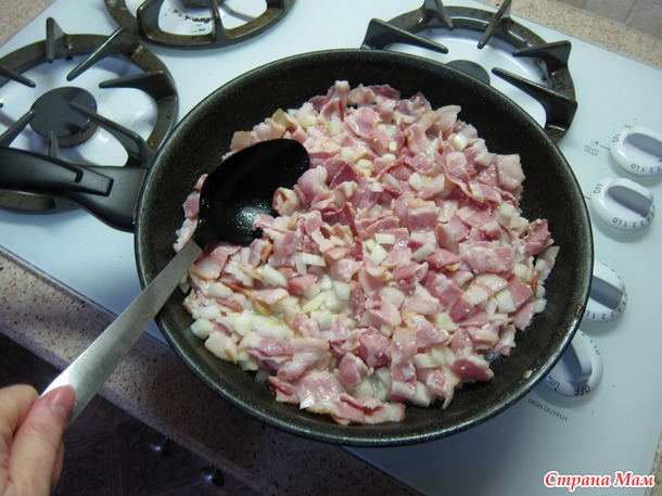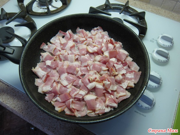 На самую огромную сковородку нарезаю мелко бекон (я когда покупаю бекон, то перебираю чуть не все упаковки, чтобы найти самый мясной)