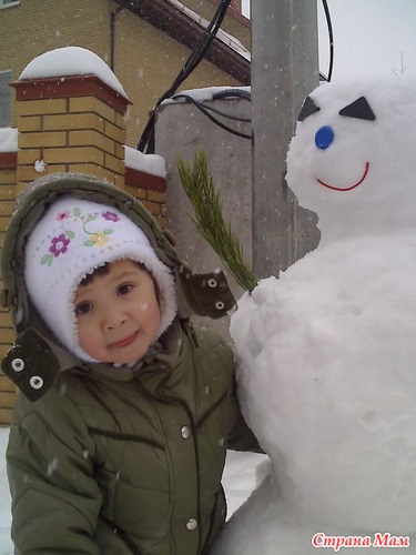 Получился на славу, Анютка пока не прилепила ему рот, нос,глазки домой спать не пошла. Перед дневным сном помахали ему из окошка и пообещали вечером выйти покормить.
