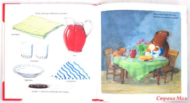 Сегодня я хочу рассказать о замечательной книжке про бобрёнка Кастора. Про него есть небольшая серия книг - у нас увы всего пара книг - остальных нет в продаже до сих пор и очень жаль. В книжке замечательные иллюстрации и рассказывается многое по этапам. Вот в этой книге, где Кастор печёт пирог к нему в гости приходит бобренок Фриппе и они ко Дню Рождения Кастора пекут именинный пирог. Все иллюстрированно! И как все подробно описано, что делать, какую посуду брать, даже как сервировать стол. В конце книги дан рецепт по которому бобры пекли этот замечательный пирог - так что можно сразу пока читаете и испечь