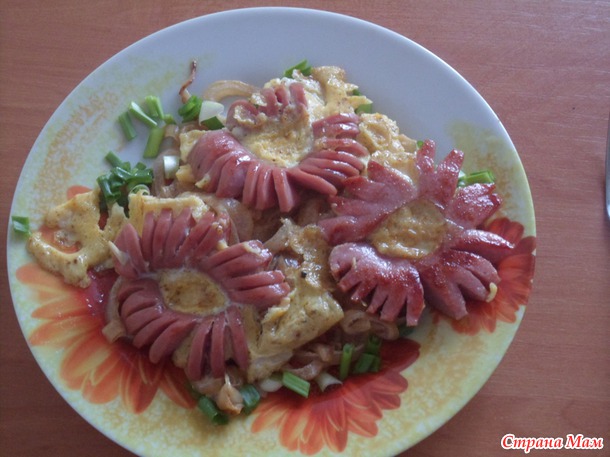 Сососки разрезала вдоль пополам. На каждой половинке сделала надрез, но не до конца, потом формируем цветочки соединяя в кружок и скалываем зубочисткой, или подструженной спичкой. Слегка обжариваем и добавляем в серединку сырое яйцо Яйца можно использовать маленькие перепелиные, а можно и обычные куриные, только я в отдельной мисочке их взбила, а то много выходит. А потом можете фантазировать, и макорошки отварить и картошечку пюре, все на ваш вкус.