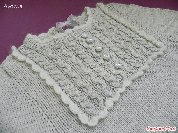 . Спицы № 3. Рукав вязала сверху из проймы, чтобы можно было довязать. На фото рукава подзадрались, а так они до основания большого пальца. Пока хватит, а потом довяжу. Схему узора брала на Парижанке, там это пуловер. Нитки у меня тоньше, поэтому описанием не пользовалась, все пришлось пересчитывать. Пряжа на обвязку - ангора, крючок 2,75. Сзади завязывается на ленточку.