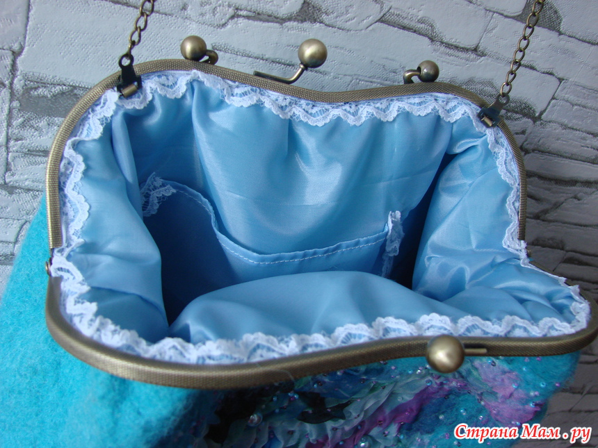 Сумочка с застёжкой фермуар, ручка, изготовлена с элементами нунофелтинга, расшита бисером и искусственным жемчугом, на подкладке кармашек, цепочка,