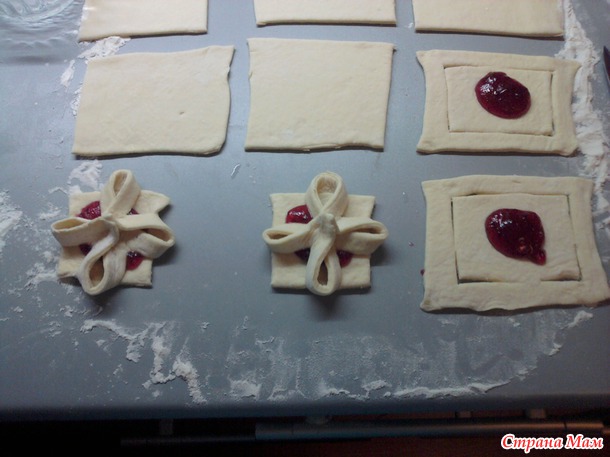 А это плюшечки. В середину кладётся варенье (у меня брусничные джем), в углах квадратов делаются надрезы угловые и соединяются с противоположным углом.