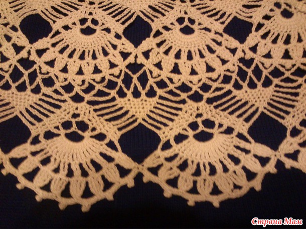 Между горизонтальными раппортами вязала по три ряда сетки по 6 в. п., чтобы выровнять волны. В этих же "сетчатых" рядах делала прибавки. Когда связала половину додумалась до другого решения, но распускать уже не хотелось. Это уже тогда в другой вещичке.