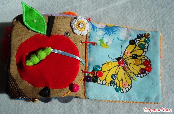 Лучше для тактильных ощущений, если ткани фона, яблока, листика и гусениц будут разных фактур.
