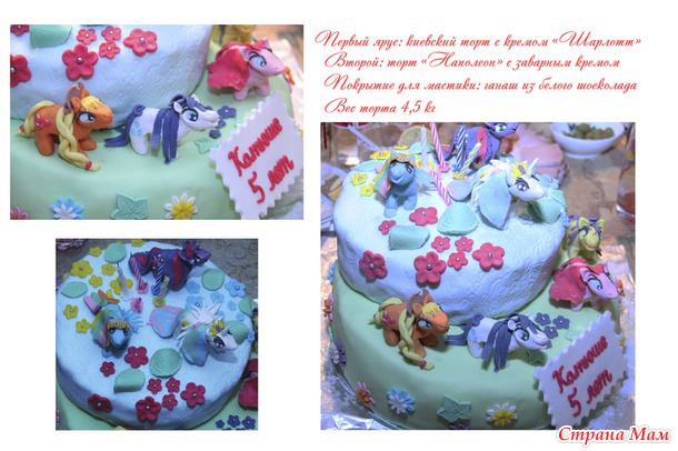 Сделала торт по просьбе моей дочки, к ее 5 летию. Первый ярус: киевский+крем "шарлотт" Второй ярус: наполеон с заварным кремом Под мастику: ганаш из белого шоколада. Вес торта 4,5кг Читать полностью