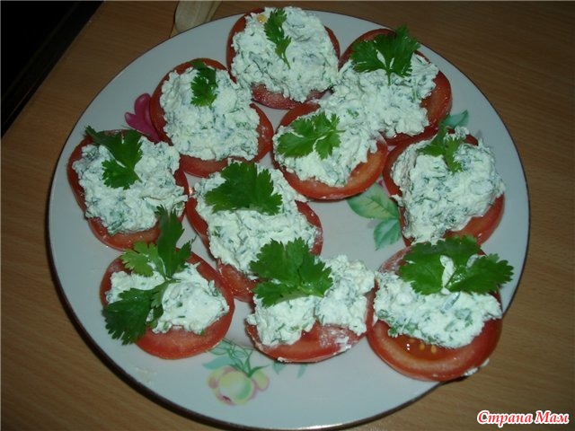 Помидоры порезать кружочками и выложить на листья салата,на них массу из феты с зеленью