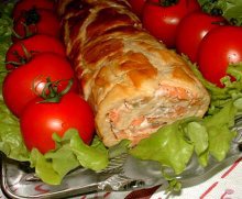 распределяем начинку на пюре и сворачиваем рулет,смазать растительным маслом ставим в духовку для запекания,минут на 15