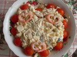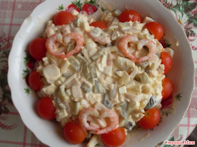 Приготовление- креветки отварить в подсоленой воде и почистить, кальмары отварить 5 минут в пдсоленой воде и орезать тонкими полосками. Огурчики (лучше маринованные,чем соленые) порезать кубиком. Лук порезать мелким кубиком. Все заправить майонезом и украсить...(я украсила креветками и помидорами черри)