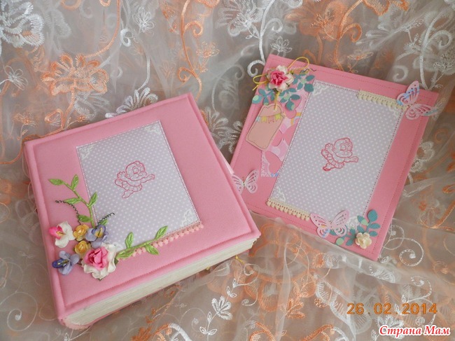 Вечер добрый, всем скрапушкам... Хочу поделиться новым альбомчиком. В общем так, формат 20*20см, вмещает 62 фотки, 20 из которых вертикальные. Есть кармашек для фото УЗИ и теги для записей. Обложка мягкая, основа пивной картон. Смотрим...