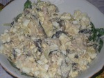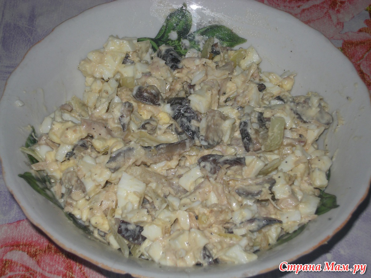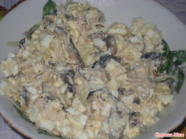 Сварить грибы и обжарить с луком, добавить вареный окорочок или 1/4 курочки, распатрашенный на мелкие кусочки и вареные яйца. Заправить все майонезом.