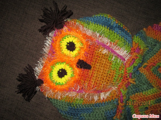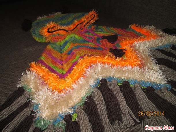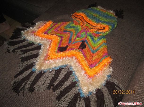 Связала за 2 дне-вечера (как была свободная минута) пончо для дочки. Крючок №5, пряжа Alize Burcum "Batik". Ушло 2,5 мотка. Еще чуток оранжевой и кремовой травки (Samba) и для кистей шоколадная и серо-коричневая Alize LanaGold Fine.